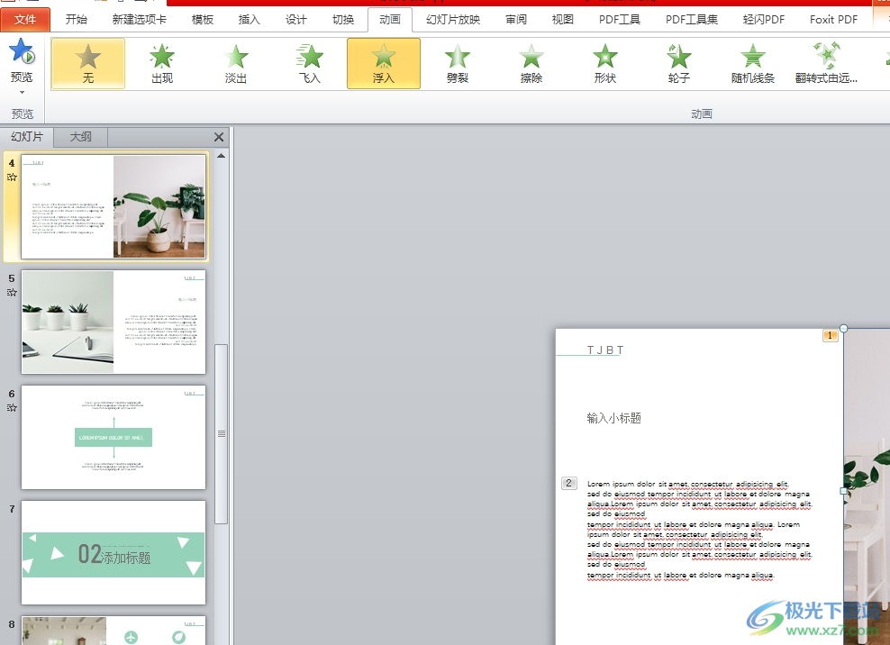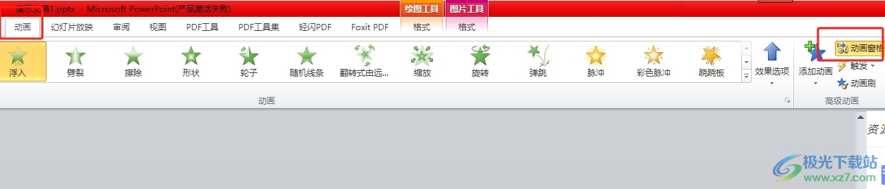 2.接着在页面上方的菜单栏中点击动画选项,将会显示出相关的选项卡,用户选择其中的动画窗格选项