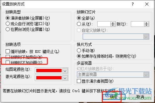 5.进入到设置放映方式窗口中,用户在放映选项板块中勾选放映时不加动画选项并按下确定按钮即可成功解决问题