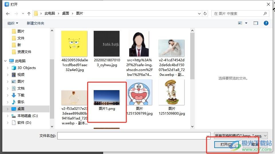 3.在打开的文件夹窗口中,用户选择其中的图片后,按下右下角的打开按钮