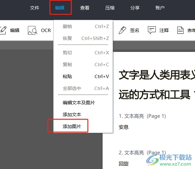 2.进入到pdf文件的编辑页面上,用户在菜单栏中点击编辑选项,将会弹出下拉选项卡,用户选择添加图片选项