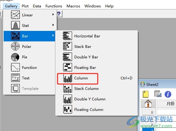 KaleidaGraph是一款功能强大的科学绘图软件,它被广泛应用在数据分析、实验结果展示和科学研究等领域中,成为了许多研究学者必备的工具,在这款软件中为用户提供了丰富的绘图工具和数据分析功能,让用户快速、准确的完成数据的分析以及图表制作,因此KaleidaGraph软件深受用户的喜爱,当用户在KaleidaGraph软件中导入数据后,想要为其生成柱形图,却不知道怎么来操作实现,其实用户只需在菜单栏中点击gallery选项和bar选项,接着选择其中的column选项来设置好x轴和y轴的代表值即可解决问题,那么接下来就让小编来向大家分享一下KaleidaGraph绘制柱形图的方法教程吧,希望用户能够喜欢。
