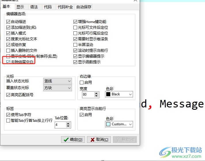 4.在弹出来的下拉选项卡中,用户在编辑器选项板块中勾选去除结尾空白选项