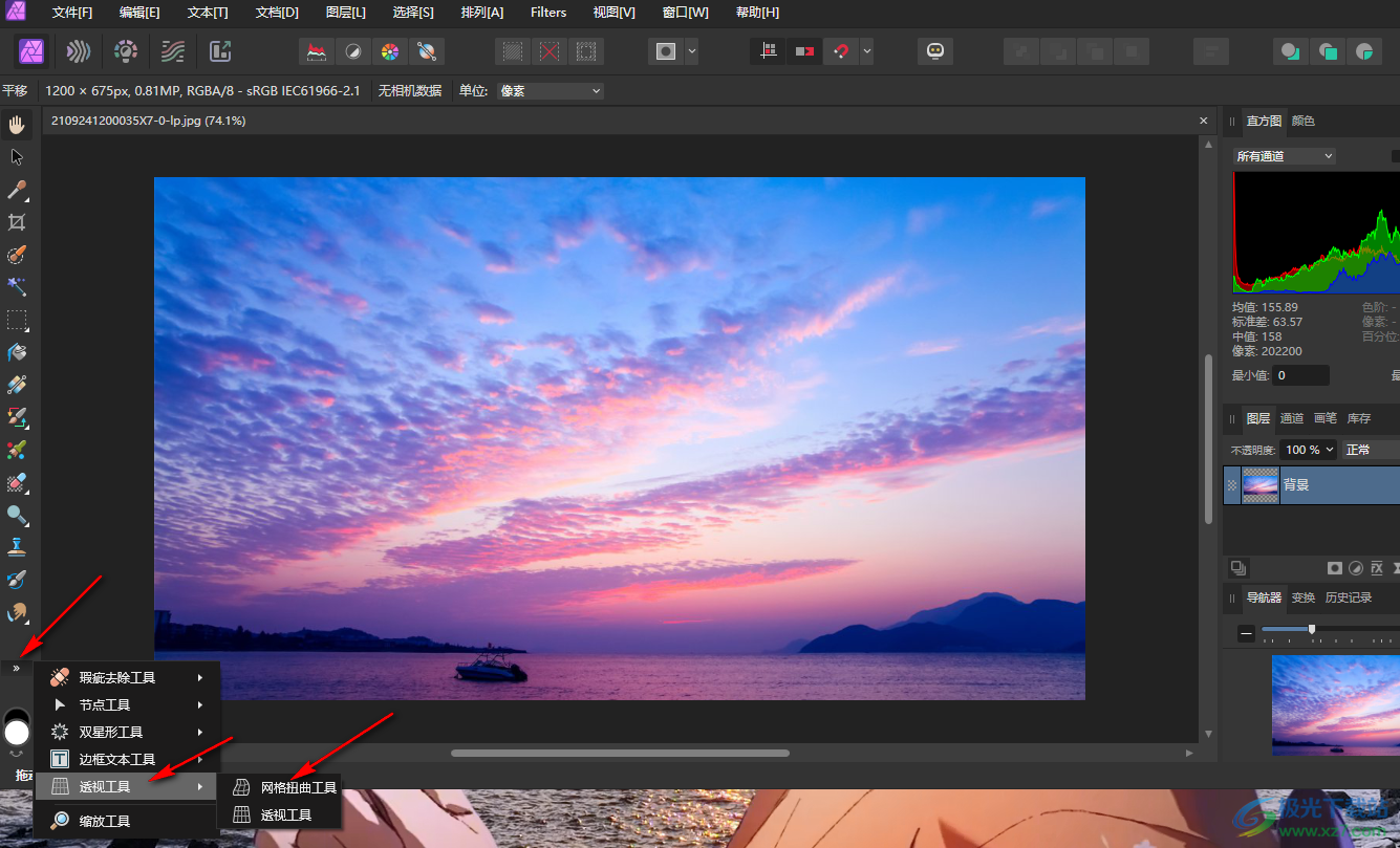 3.接着,在左侧下方的位置点击一下箭头图标,然后点击打开【透视工具】-【透视扭曲工具】。