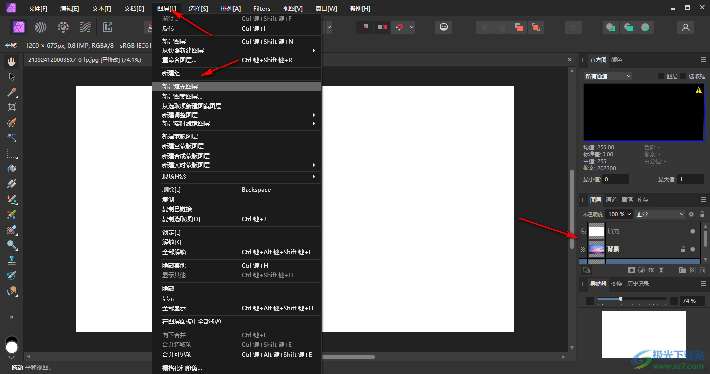 2.导入好图像之后,我们需要在页面顶部的位置点击【图层】选项,在打开的子选项中选择【创建填充图层】,那么即可在右侧页面创建出一个空白的图层,将空白的图层移动到背景图层的下方。