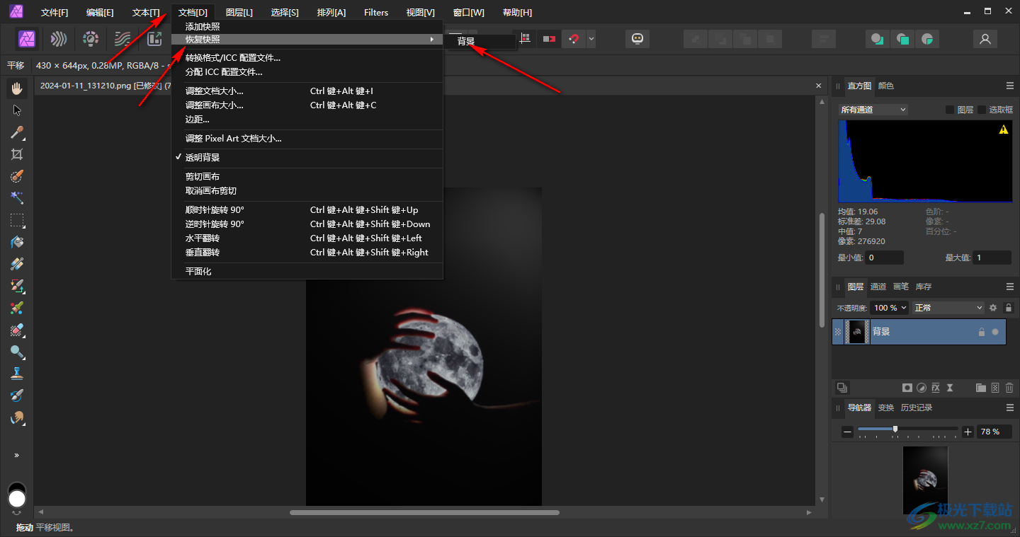4.那么我们的图片就会有光照效果的展示,但是当你取消对图片的所有设计的时候,那么我们可以点击【文档】-【恢复快照】-【背景】。