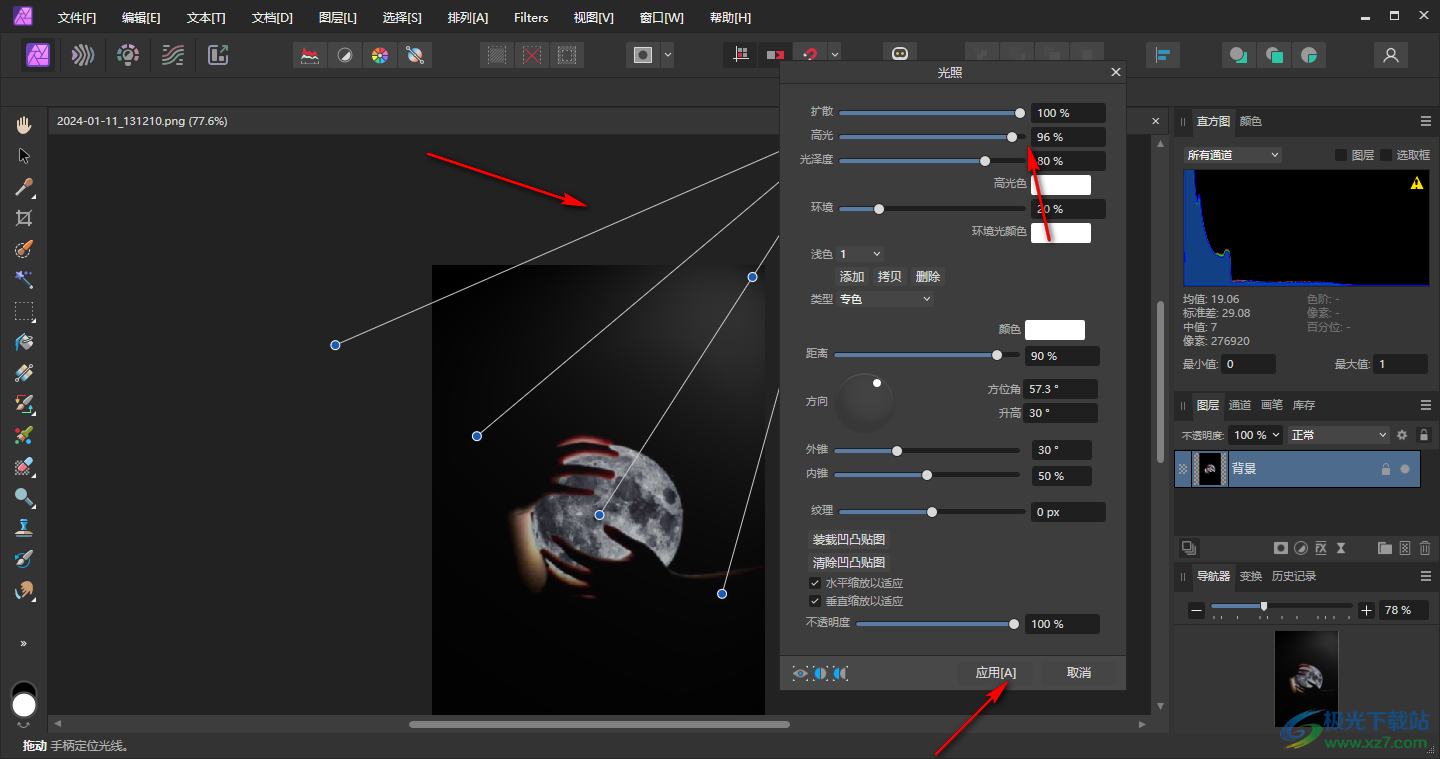 3.然后在旁边打开的窗口中,可以根据调整一下相关的参数,来实现光照效果的添加,最后点击应用按钮即可。