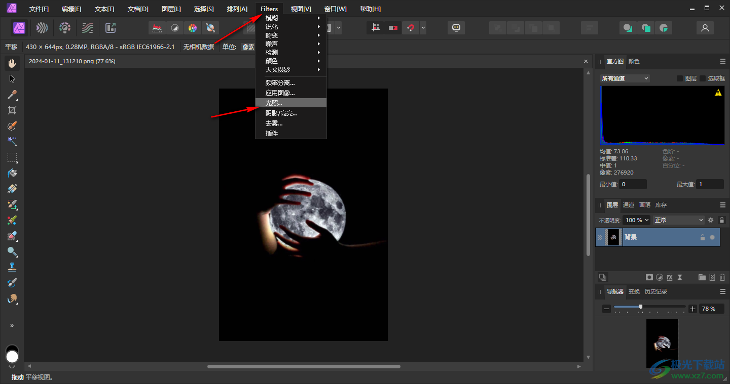 2.这时,我们可以随意的对添加进来的图片进行设计,比如点击【filters】选项,为图片添加一个光照的滤镜。