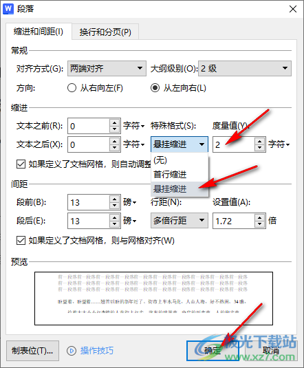3.进入到页面中之后,直接将【特殊格式】下方的选项点击打开,然后选择【悬挂缩进】,在后面的【度量值】的框中输入【2】,之后点击确定按钮。