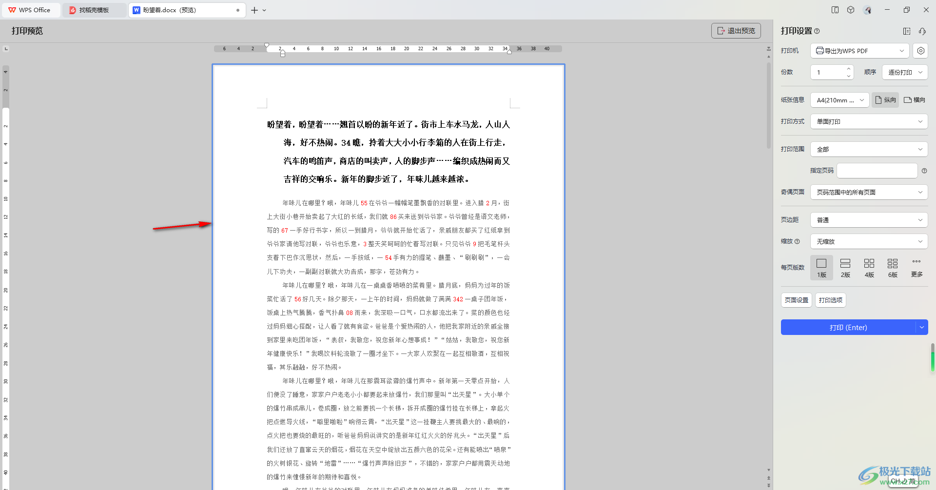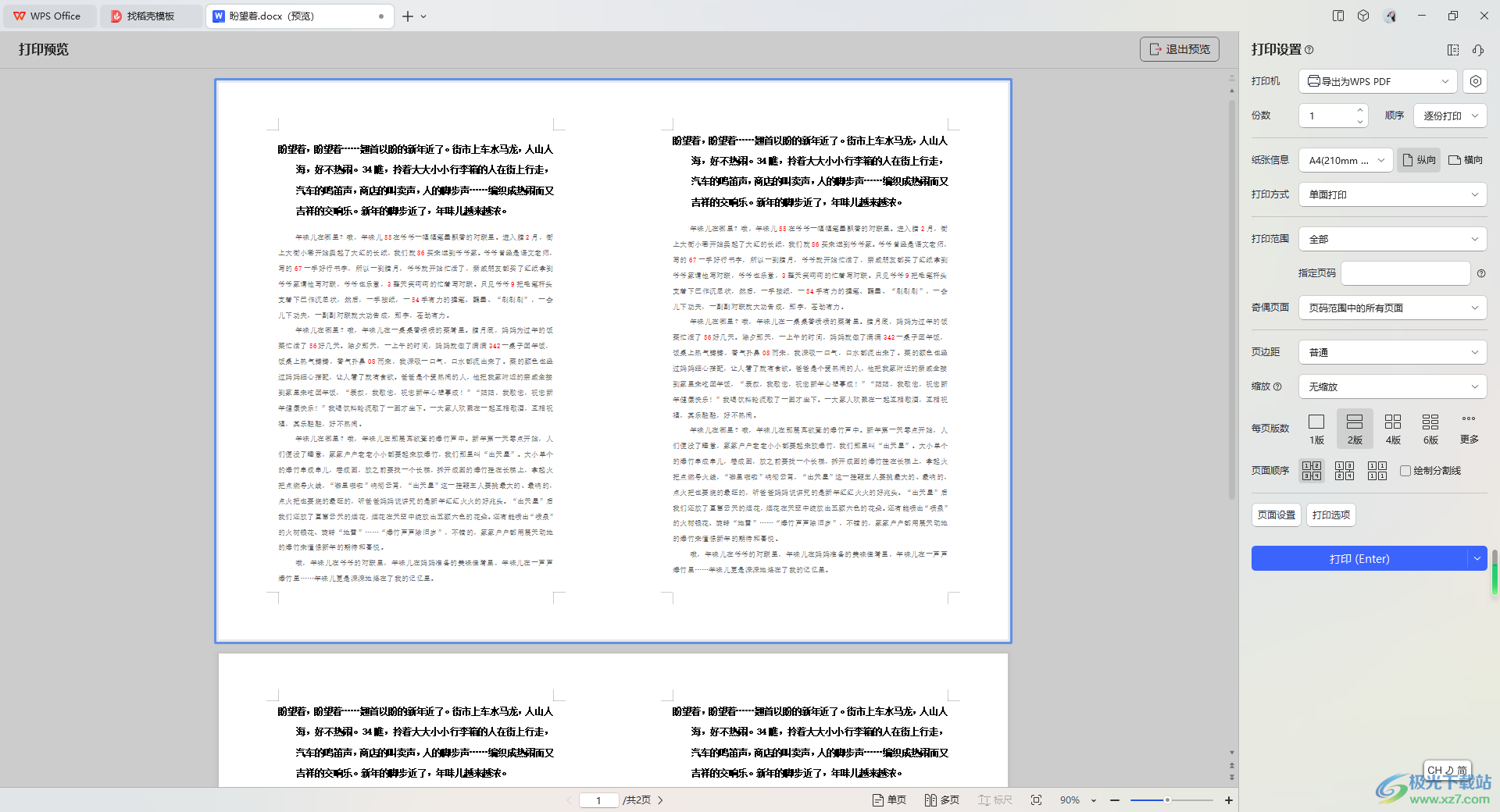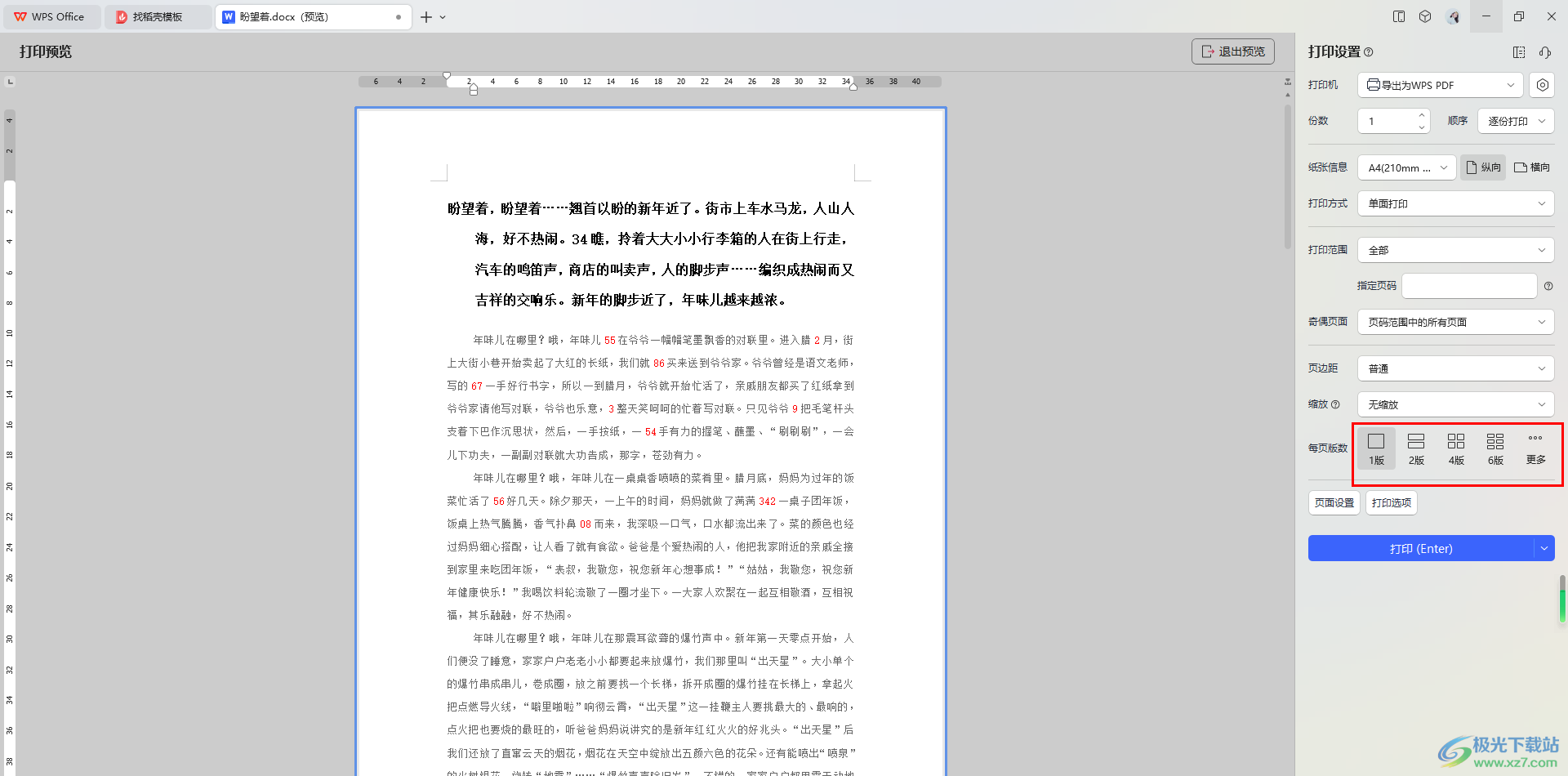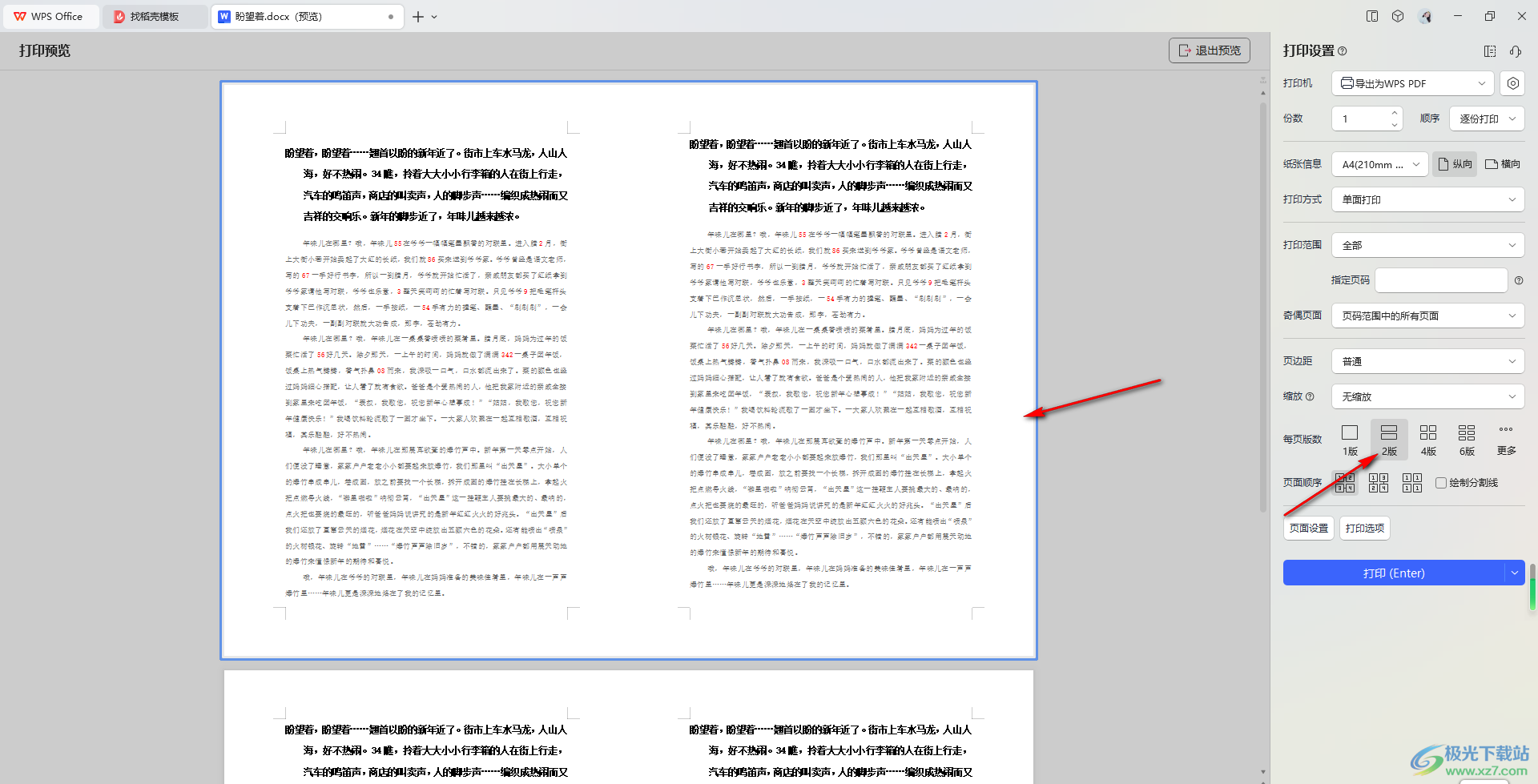 我们在进行文字文档的编辑修改的过程中,很多时候,需要对编辑好的文字进行打印成纸质版,而在打印的时候,如果你不对文档进行相应的设置,那么打印出来的文档就是一页一版,如果你想要将文档打印成一页4版、6版、9版或者是更多版的话,那么就需要在打印预览的窗口中进行设置,提供的版数是多种的,因此你可以根据自己的需求来选择相应的版数,下方是关于如何实用wps word文档设置一页打印多版的具体操作方法,如果你需要的情况下可以看看方法教程,希望对大家有所帮助。