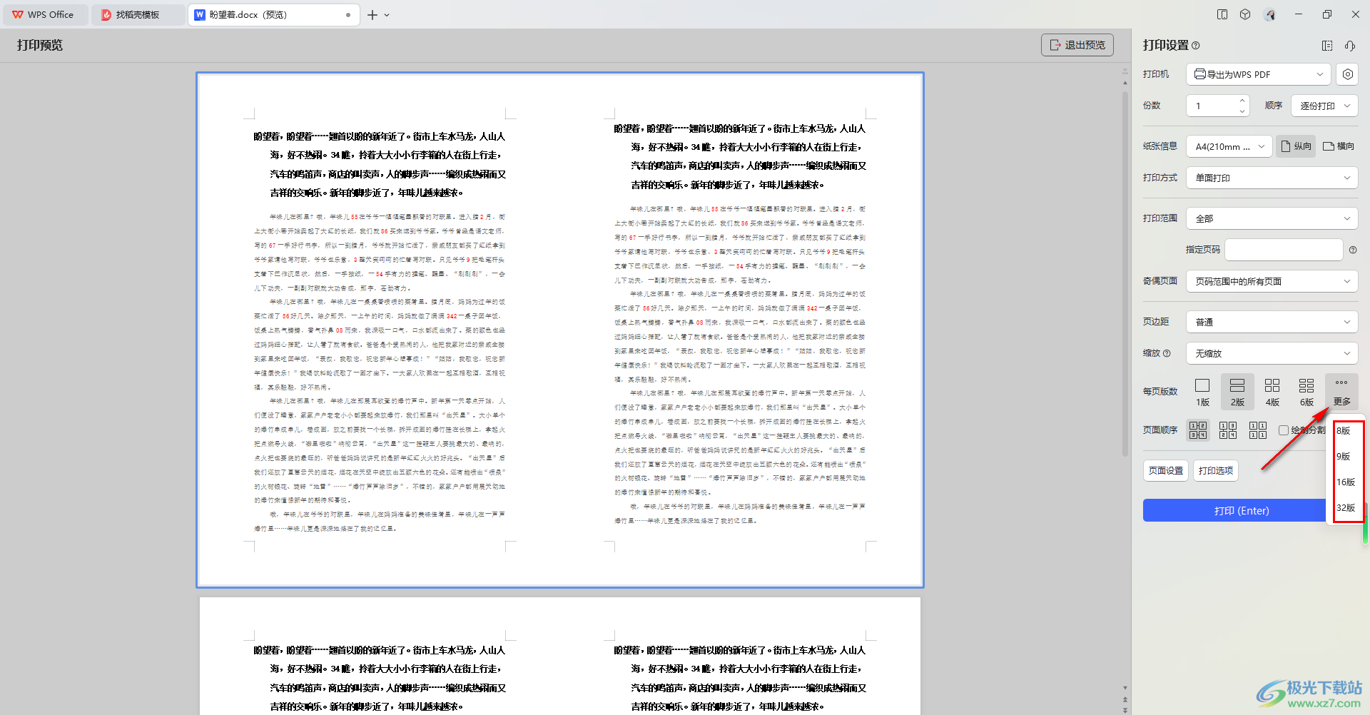5.如果你想要将页面设置成更多的版数,那么点击【更多】,在打开的子选项中可以选择自己喜欢的版数进行设置,最后点击打印即可打印文档。