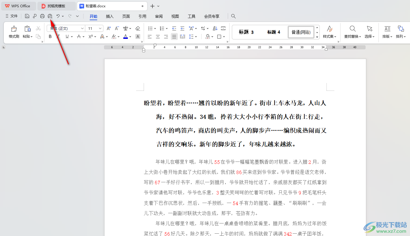 1.将文字文档打开之后,我们需要进入到打印预览的窗口中,点击左上角的【打印预览】图标进入。