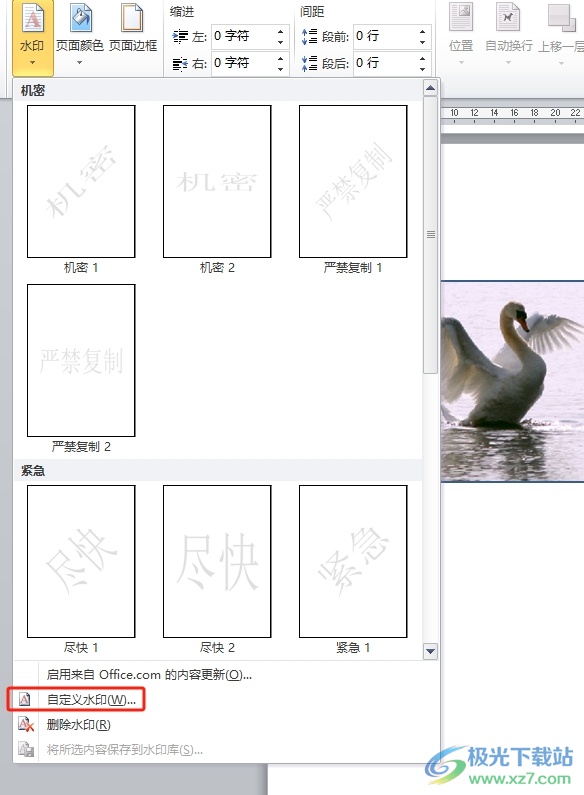 3.在弹出来的下拉选项卡中,用户点击自定义水印选项,将会打开新窗口