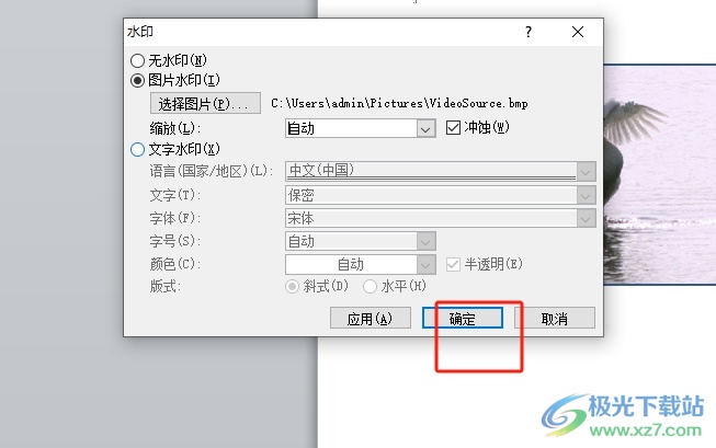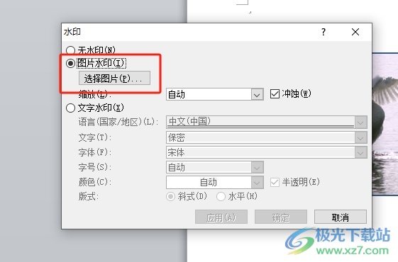 4.来到水印窗口中,用户勾选图片水印选项并按下选择图片按钮