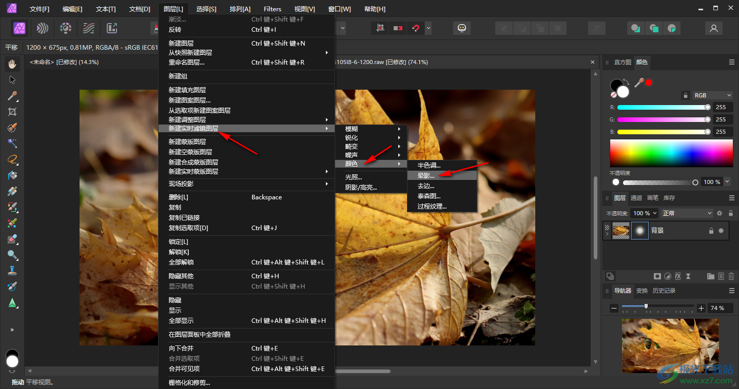 3.随后,即可在打开的子选项中,将其中的【新建实时滤镜图层】选项,然后点击【颜色】-【晕影】。