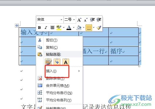 4.或者用户用鼠标右键点击表格,在弹出来的菜单中,用户选择插入选项