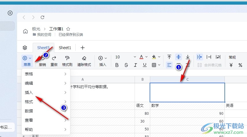 3、第三步,进入表格文档编辑页面之后,我们在该页面中点击一个空白单元格,然后打开“菜单”工具,再打开“插入”工具