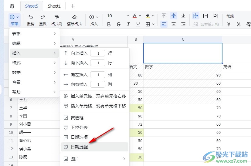 4、第四步,在插入的子菜单列表中,我们找到“日期提醒”选项,点击打开该选项