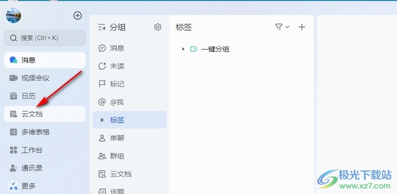 1、第一步,我们在电脑中点击打开飞书软件,然后在飞书页面中找到“云文档”选项,点击打开该选项