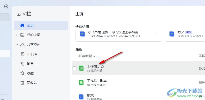 2、第二步,进入飞书的云文档页面之后,我们在该页面中找到需要编辑的表格文档,点击打开该文档