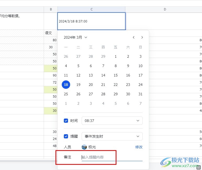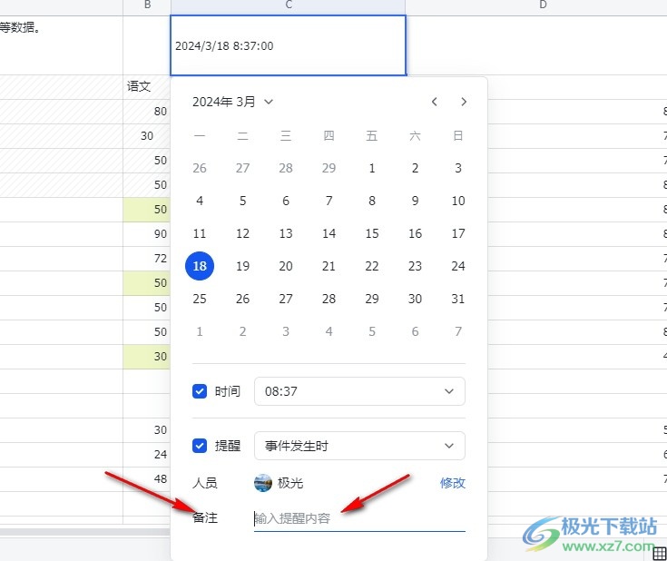 5、第五步,点击日期提醒选项之后,我们在提醒框中找到“备注”一栏,在该栏中输入提醒内容即可