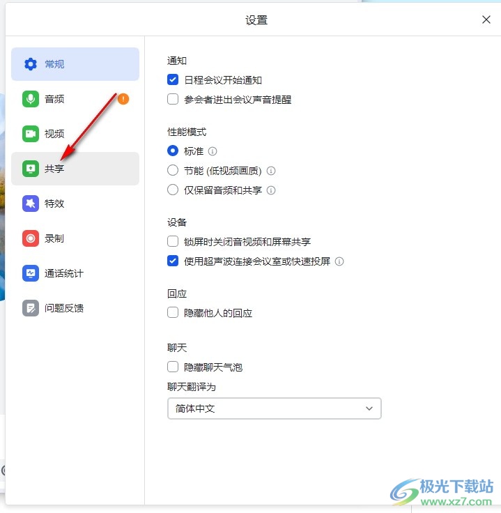 4、第四步,打开设置选项之后,我们在飞书软件的设置页面中找到“共享”设置,点击打开该设置