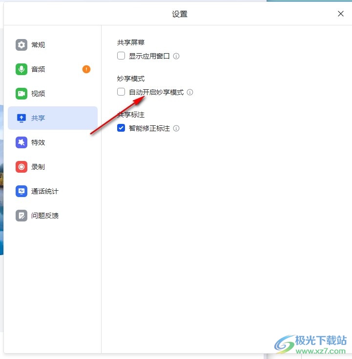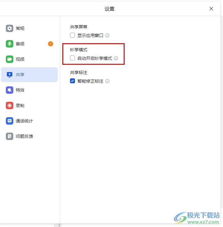 5、第五步,打开共享设置之后,我们在共享设置页面中取消勾选“自动开启妙享模式”选项即可