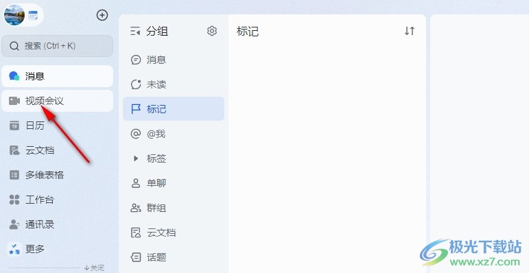 1、第一步,我们先点击打开电脑中的飞书软件,然后在飞书页面中找到并打开视频会议选项