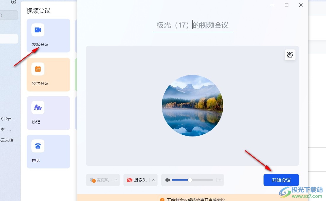2、第二步,进入视频会议页面之后,我们在该页面中先点击“发起会议”选项,再在弹框中点击开始会议选项
