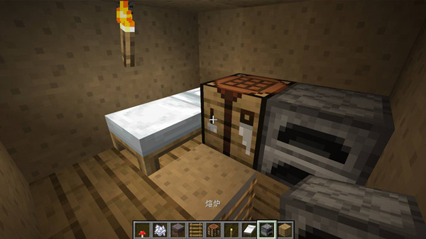 7、布置小家具:放张床、工作台和熔炉,再点上火把,迷你家就完工啦!