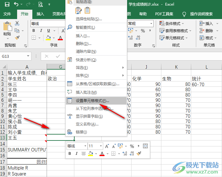 2、第二步,进入表格文档页面之后,我们在该页面中先完成数据的编辑,然后选中需要设置底纹的单元格,右键单击选择“设置单元格格式”