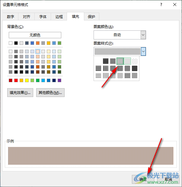 5、第五步,在图案样式的下拉列表中,我们可以看到各种类型的底纹样式,选择一个自己需要的,最后点击页面下方的“确定”选项即可