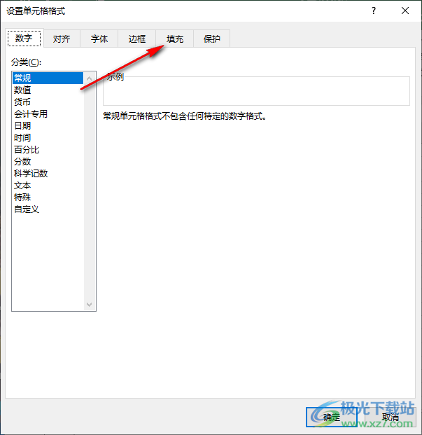 3、第三步,进入设置单元格格式页面之后,我们在该页面中先找到“填充”选项,点击打开该选项