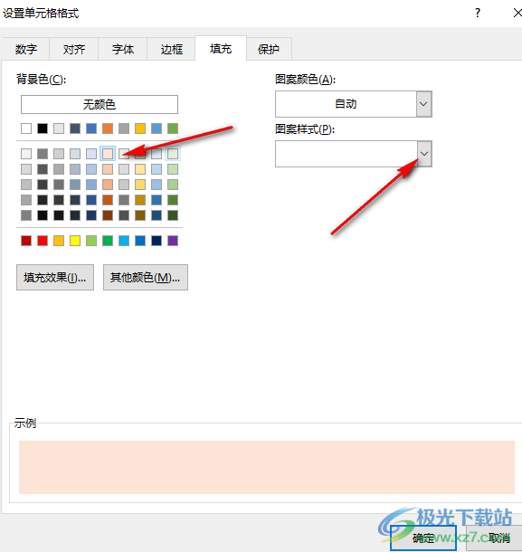 4、第四步,在填充页面中,我们首先选择一个主题颜色,然后打开右侧的“图案样式”选项