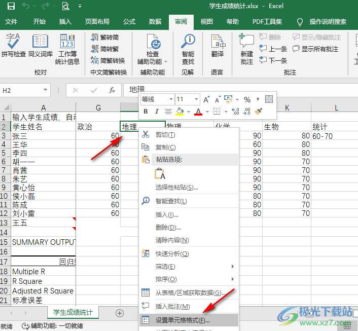 2、第二步,进入表格文档页面之后,我们在该页面中选中一个单元格,然后右键单击选择“设置单元格格式”选项