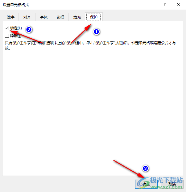 3、第三步,进入设置单元格格式页面之后,我们在该页面中先找到“保护”选项,进入保护页面之后,我们将“锁定”选项进行勾选,然后点击“确定”