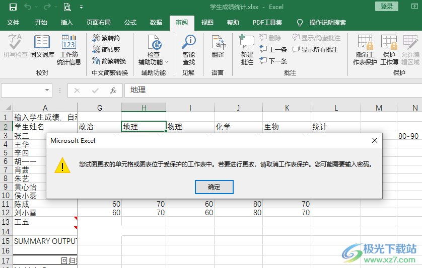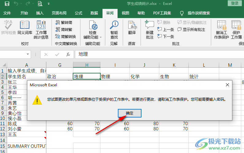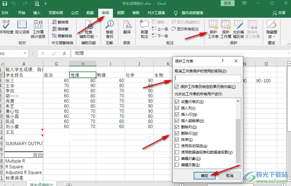 4、第四步,接着Wimbledon在表格的工具栏中打开“审阅”工具,再在子工具栏中找到“保护工作表”选项,点击该选项,然后在弹框中输入密码,再在下方的框内将需要的编辑权限进行勾选,最后点击“确定”选项即可
