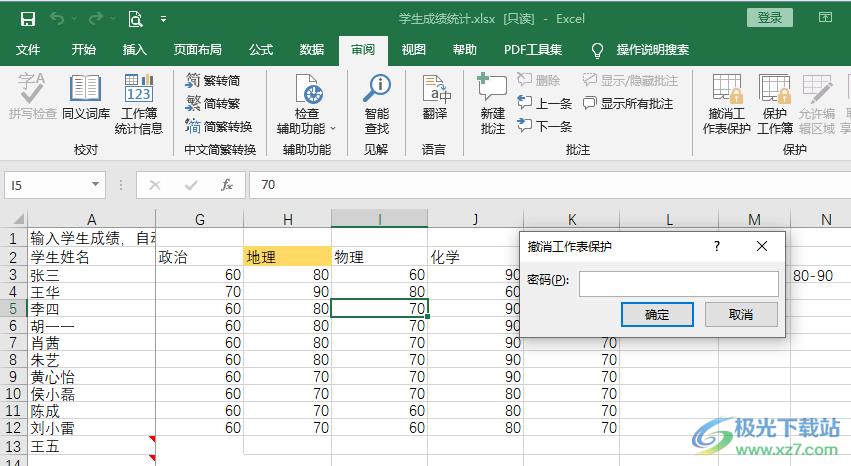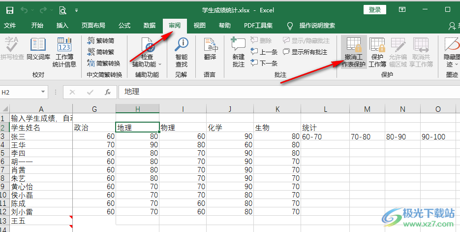 2、第二步,进入表格文档的页面之后,我们在该页面中选中一个单元格,然后打开工具栏中的“审阅”工具,再在子工具列表中找到“保护工作表”选项,查看该选项是否显示为“撤销工作表保护”
