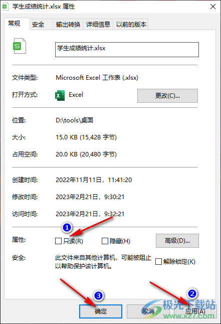 2、第二步,进入表格文档的属性页面之后,我们在该页面中找到“只读”选项,将该选项取消勾选,最后点击“应用”和“确定”选项即可