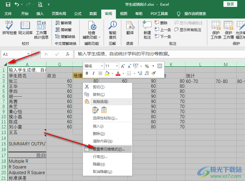 4、第四步,有的小伙伴可能会担心自己误操作将工作表进行保护又忘记密码,为了避免这种情况的发生,我们可以点击表格左上角的三角图标,选中整个表格,然后右键单击选择“设置单元格格式”选项