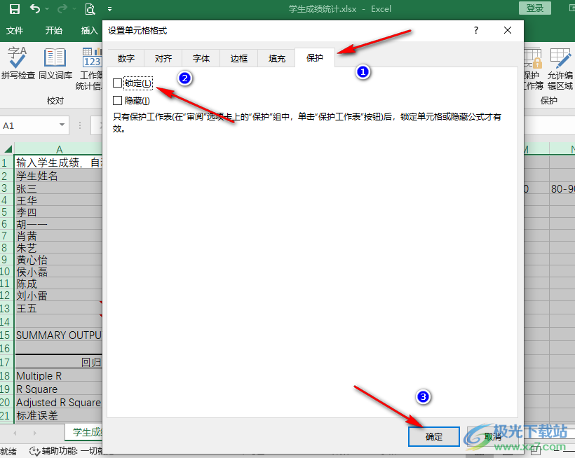 5、第五步,进入设置单元格格式页面之后,我们点击“保护”选项,然后将保护页面中的“锁定”选项取消勾选,最后点击“确定”选项即可