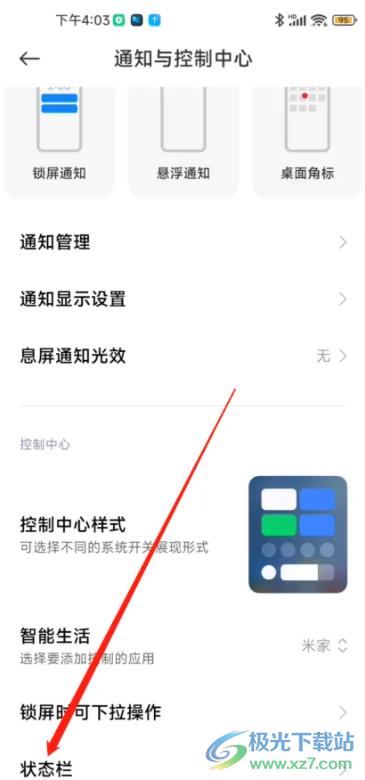 2.页面发生切换,在打开的通知和控制中心页面中,用户需要在控制中心板块中找到状态栏选项