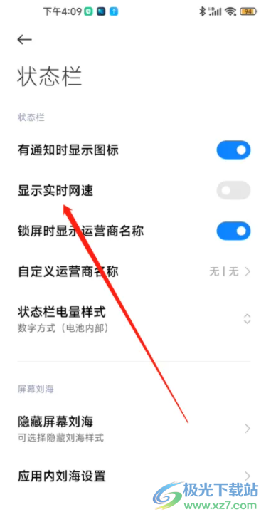 3.在弹出来的状态栏页面中,用户可以看到有通知时显示图标、显示实时网速、自定义运营商名称等选项,需要将显示实时网速选项右侧的开关标识打开即可