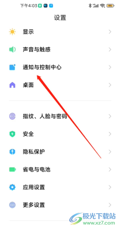1.解锁小米手机并在桌面上点击设置图标进入,进入到设置页面后,用户选择其中的通知与控制中心选项
