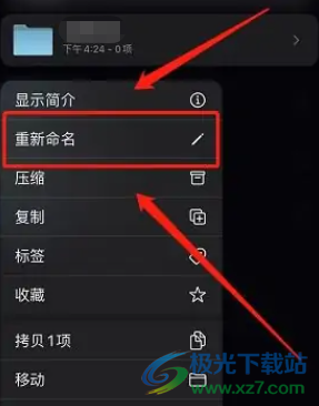 2.这时用户在页面上找到需要重命名的文件夹并长按,将会弹出相关的选项卡,用户选择其中的重新命名选项