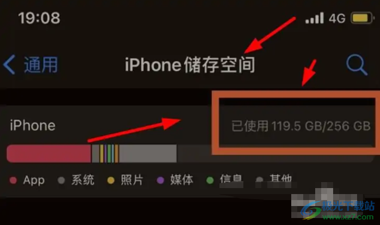 3.随后用户进入到iPhone储存空间页面中,就会发现显示出来的储存空间信息,用户会看到已使用的存储空间信息,用户简单换算一下即可知道iPhone手机的剩余内存容量了