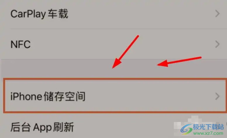 2.接着在打开的通用页面中,可以看到有NFC、iPhone后台储存空间、后台app刷新等选项,用户直接选择iPhone储存空间选项