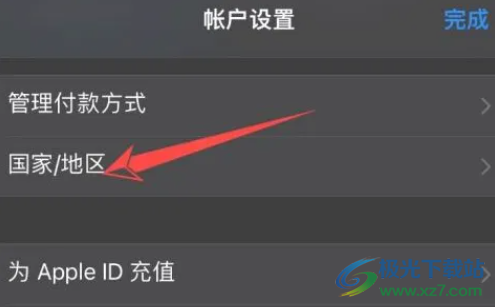 2.接着用户进入到账户页面上,可以看到有管理付款方式、国家/地区、为apple id充值等选项,用户选择国家/地区选项