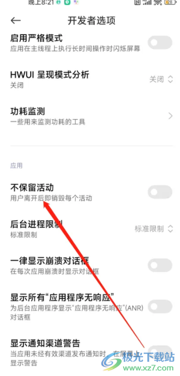 3.在打开的开发者选项页面中,用户在应用板块中直接将不保留应用右侧的开关按钮打开即可,成功开启后有用户离开一个应用就会销毁每个活动
