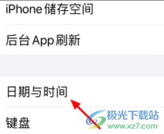 2.页面将会发生切换,用户在通用页面中可以看到iPhone储存空间、后台app刷新、日期和时间等选项,点击其中的日期和时间选项