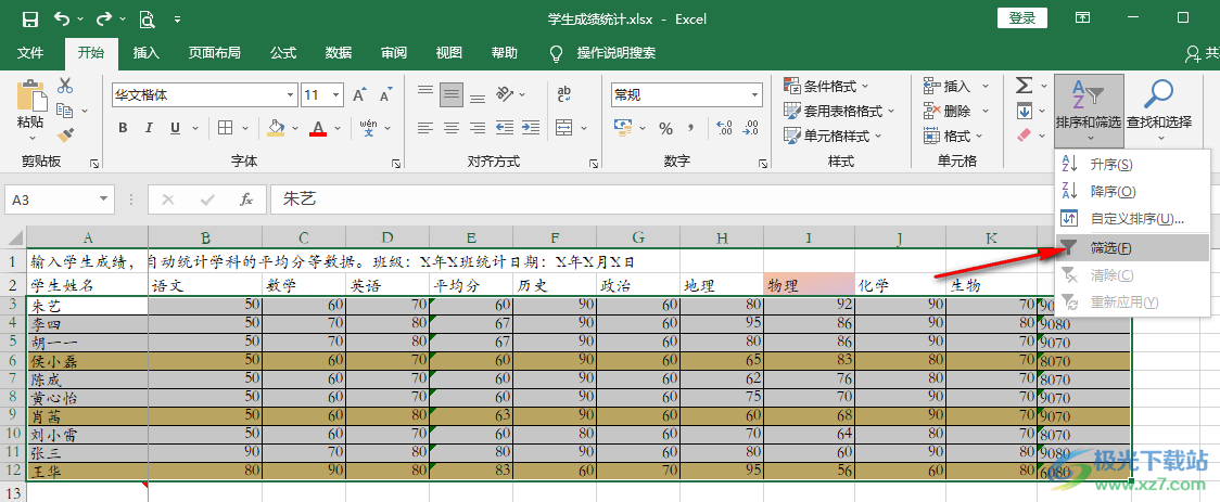 3、第三步,我们打开“筛选”工具,然后在下拉列表中点击选择“筛选”选项